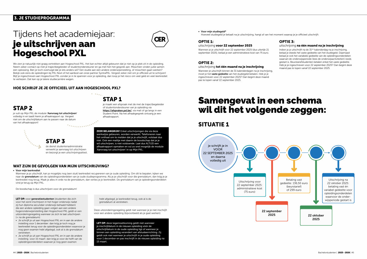 Indien je je uitschrijft na de 31 ste kalenderdag na je inschrijving, betaal je steeds het vaste gedeelte van het studiegeld. Daarnaast betaal je ook het variabele gedeelte van de opleidingsonderdelen waarvan de onderwijsperiode( lees de onderwijsactiviteiten) reeds gestart is. Beurstariefstudenten betalen enkel het vaste gedeelte. Heb je je ingeschreven voor 22 september 2025? Dan begint deze maand pas te lopen vanaf 22 september 2025.