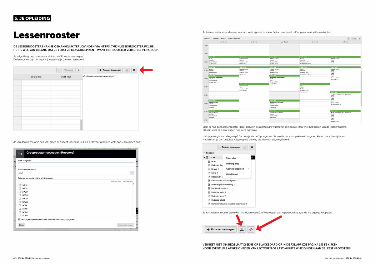 VERGEET NIET OM REGELMATIG EENS OP BLACKBOARD OF IN DE PXL APP( ZIE PAGINA 14) TE KIJKEN VOOR EVENTUELE AFWEZIGHEDEN VAN LECTOREN OF LAST MINUTE WIJZIGINGEN AAN JE LESSENROOSTER!!