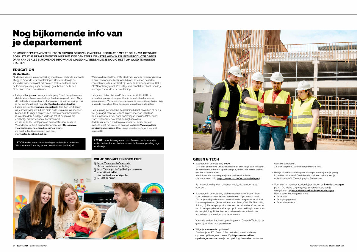 SOMMIGE DEPARTEMENTEN HEBBEN ERVOOR GEKOZEN OM EXTRA INFORMATIE MEE TE DELEN VIA DIT START- BOEK. STAAT JE DEPARTEMENT ER NIET BIJ? KIJK DAN ZEKER OP HTTPS:// WWW. PXL. BE / INTRODUCTIEDAGEN. DAAR KAN JE ALLE BIJKOMENDE INFO VAN JE OPLEIDING VINDEN DIE JE NODIG HEBT OM GOED TE KUNNEN STARTEN!
