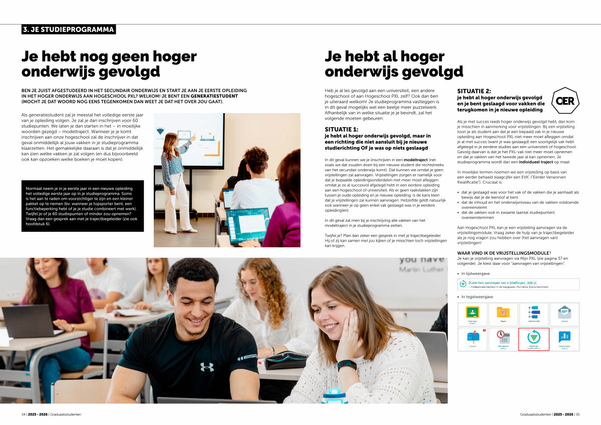 Als je met succes reeds hoger onderwijs gevolgd hebt, dan kom je misschien in aanmerking voor vrijstellingen. Bij een vrijstelling toon je als student aan dat je een bepaald vak in je nieuwe opleiding aan Hogeschool PXL niet meer moet afleggen omdat je al met succes( want je was geslaagd) een soortgelijk vak hebt afgelegd in je eerdere studies aan een universiteit of hogeschool. Gevolg daarvan is dat je het PXL-vak niet meer moet opnemen en dat je vakken van het tweede jaar al kan opnemen. Je studieprogramma wordt dan een individueel traject op maat.