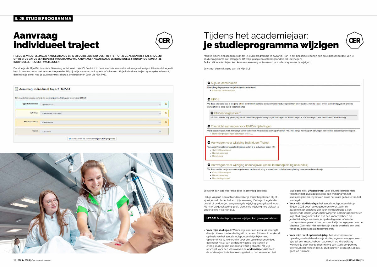 Dat doe je via Mijn PXL( module“ Aanvraag individueel traject”). Je duidt in deze module aan welke vakken je wil volgen. Uiteraard doe je dit best in samenspraak met je trajectbegeleider. Hij / zij zal je aanvraag ook goed- of afkeuren. Als je individueel traject goedgekeurd wordt, dan moet je enkel nog je studiecontract digitaal ondertekenen( ook via Mijn PXL).