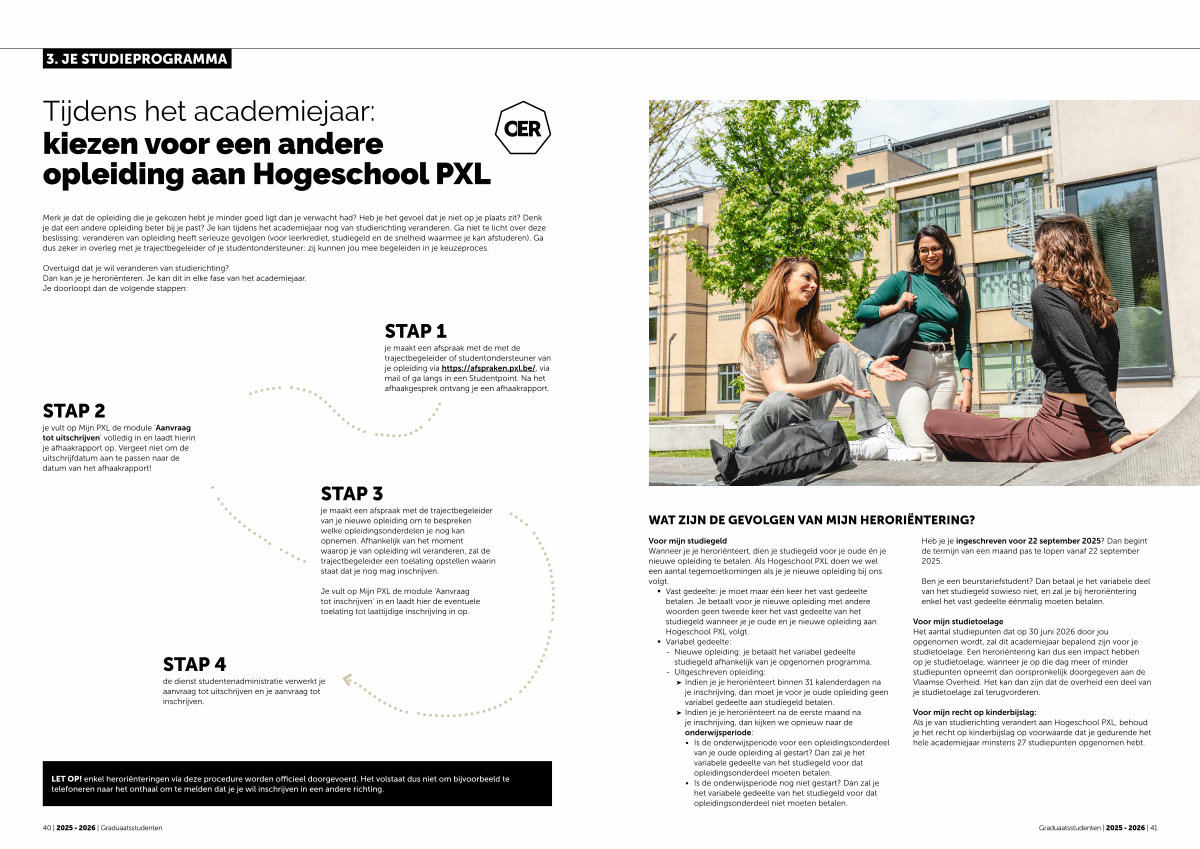 Voor mijn studiegeld Wanneer je je heroriënteert, dien je studiegeld voor je oude én je nieuwe opleiding te betalen. Als Hogeschool PXL doen we wel een aantal tegemoetkomingen als je je nieuwe opleiding bij ons volgt.