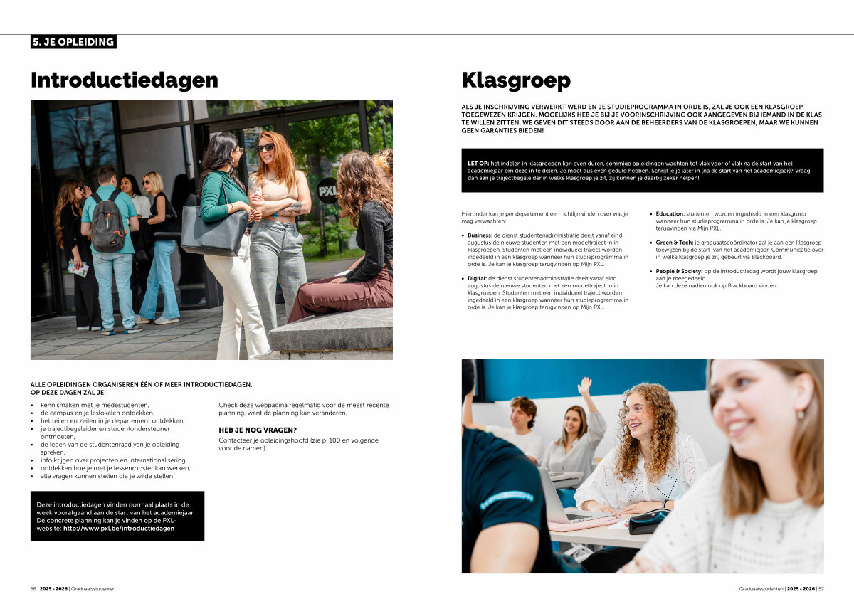 Deze introductiedagen vinden normaal plaats in de week voorafgaand aan de start van het academiejaar. De concrete planning kan je vinden op de PXLwebsite: http:// www. pxl. be / introductiedagen