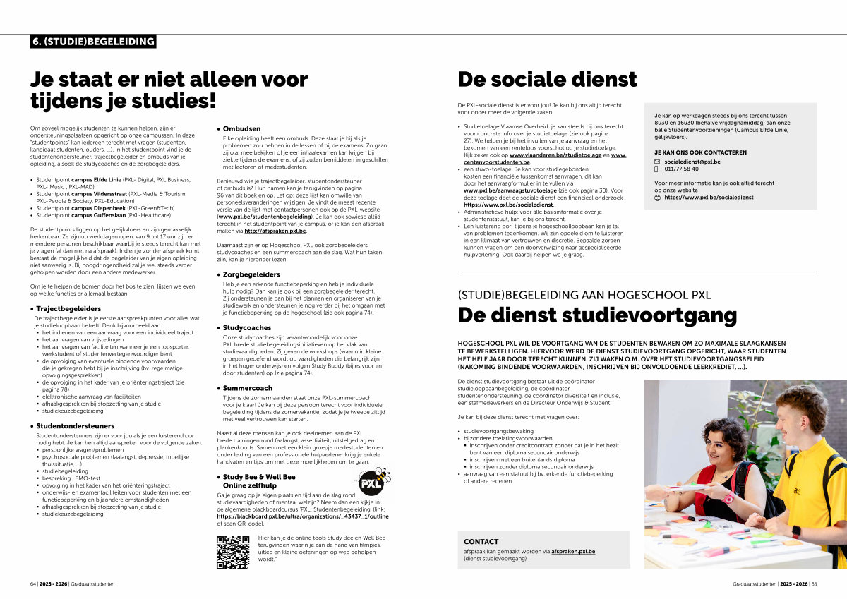 Benieuwd wie je trajectbegeleider, studentondersteuner of ombuds is? Hun namen kan je terugvinden op pagina 96 van dit boek en op. Let op: deze lijst kan omwille van personeelsveranderingen wijzigen. Je vindt de meest recente versie van de lijst met contactpersonen ook op de PXL-website( www. pxl. be / studentenbegeleiding). Je kan ook sowieso altijd terecht in het studentpoint van je campus, of je kan een afspraak maken via http:// afspraken. pxl. be.