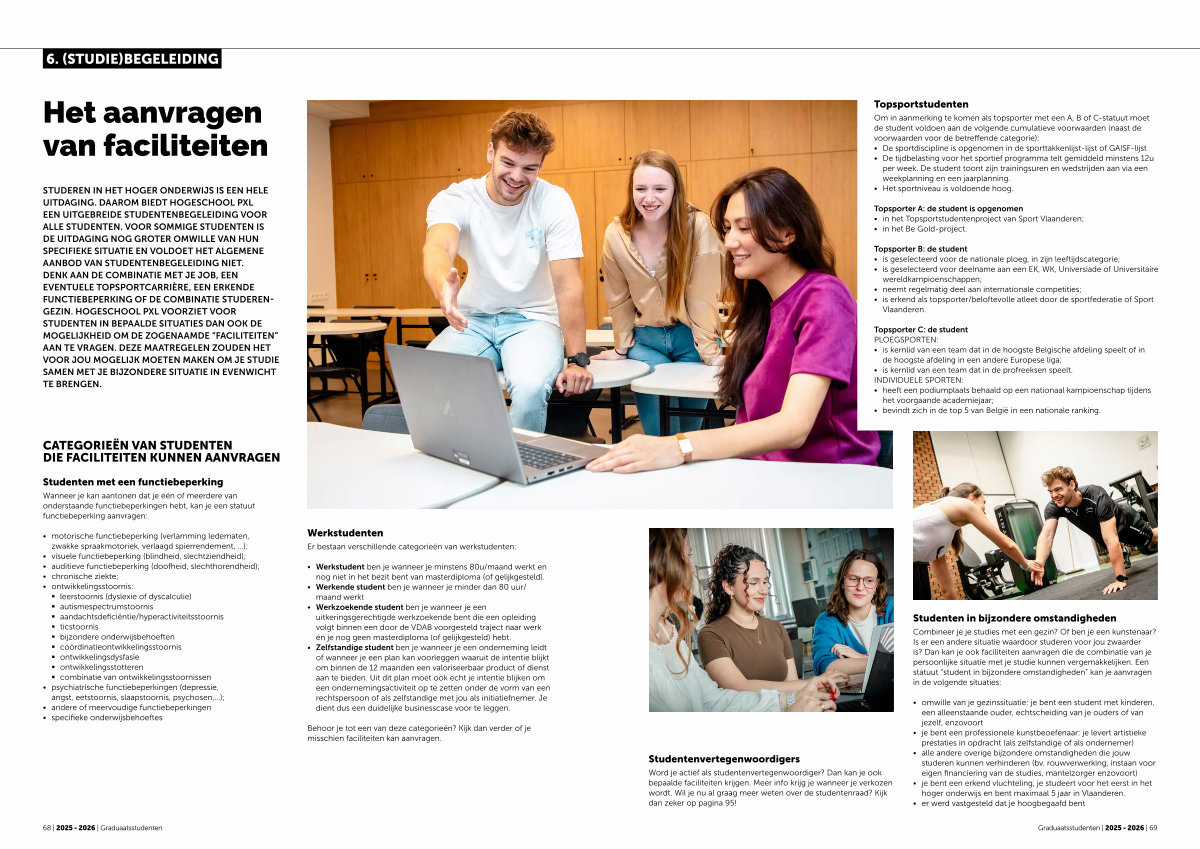 STUDEREN IN HET HOGER ONDERWIJS IS EEN HELE UITDAGING. DAAROM BIEDT HOGESCHOOL PXL EEN UITGEBREIDE STUDENTENBEGELEIDING VOOR ALLE STUDENTEN. VOOR SOMMIGE STUDENTEN IS DE UITDAGING NOG GROTER OMWILLE VAN HUN SPECIFIEKE SITUATIE EN VOLDOET HET ALGEMENE AANBOD VAN STUDENTENBEGELEIDING NIET. DENK AAN DE COMBINATIE MET JE JOB, EEN EVENTUELE TOPSPORTCARRIÈRE, EEN ERKENDE FUNCTIEBEPERKING OF DE COMBINATIE STUDEREN- GEZIN. HOGESCHOOL PXL VOORZIET VOOR STUDENTEN IN BEPAALDE SITUATIES DAN OOK DE MOGELIJKHEID OM DE ZOGENAAMDE“ FACILITEITEN” AAN TE VRAGEN. DEZE MAATREGELEN ZOUDEN HET VOOR JOU MOGELIJK MOETEN MAKEN OM JE STUDIE SAMEN MET JE BIJZONDERE SITUATIE IN EVENWICHT TE BRENGEN.