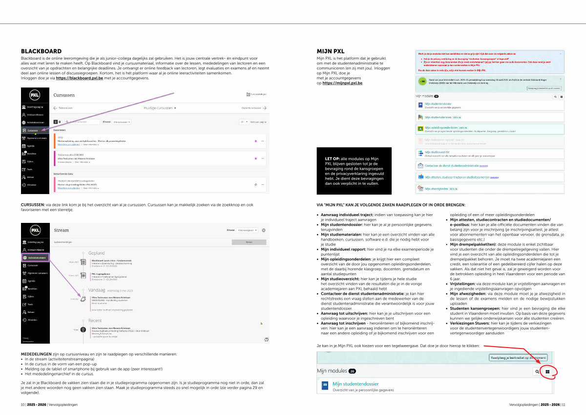 Blackboard is de online leeromgeving die je als junior-collega dagelijks zal gebruiken. Het is jouw centrale vertrek- én eindpunt voor alles wat met leren te maken heeft. Op Blackboard vind je cursusmateriaal, informatie over de lessen, mededelingen van lectoren en een overzicht van je opdrachten en belangrijke deadlines. Je ontvangt er online feedback van lectoren, legt evaluaties en examens af en neemt deel aan online lessen of discussiegroepen. Kortom, het is hét platform waar al je online leeractiviteiten samenkomen. Inloggen doe je via https:// blackboard. pxl. be met je accountgegevens.