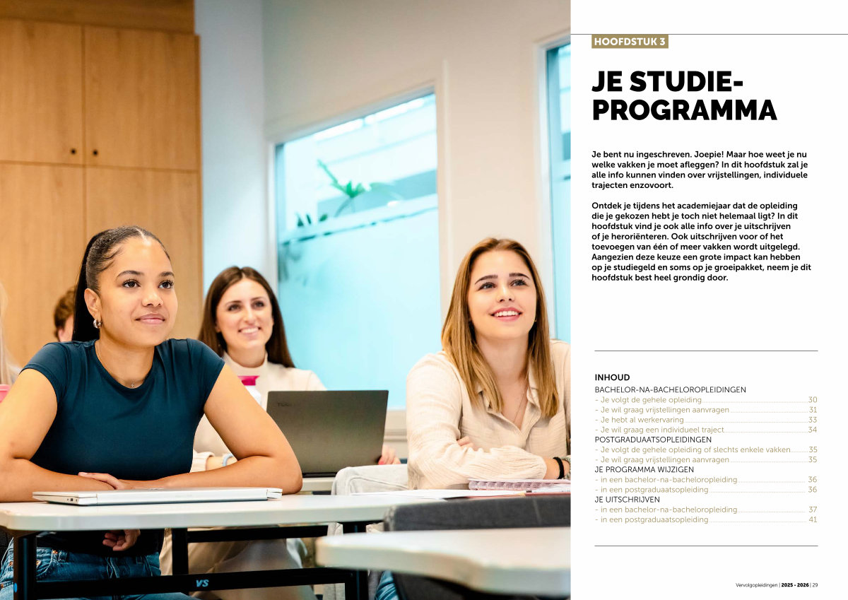 INHOUD BACHELOR-NA-BACHELOROPLEIDINGEN- Je volgt de gehele opleiding....................................................................................... 30- Je wil graag vrijstellingen aanvragen................................................................ 31- Je hebt al werkervaring..................................................................................................... 33- Je wil graag een individueel traject.................................................................... 34 POSTGRADUAATSOPLEIDINGEN- Je volgt de gehele opleiding of slechts enkele vakken............... 35- Je wil graag vrijstellingen aanvragen................................................................ 35 JE PROGRAMMA WIJZIGEN- in een bachelor-na-bacheloropleiding........................................................ 36- in een postgraduaatsopleiding............................................................................... 36 JE UITSCHRIJVEN- in een bachelor-na-bacheloropleiding........................................................ 37- in een postgraduaatsopleiding................................................................................ 41