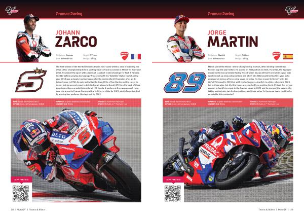 The first winner of the Red Bull Rookies Cup in 2007 came within a race of claiming the 2010 125cc Championship before posting back-to-back successes in Moto2™ in 2015 and 2016 . He wowed the sport with a series of standout rookie showings for Tech 3 Yamaha in 2017 before growing increasingly frustrated with his ‘ Satellite ’ status the following year . 2019 was a deeply troubled season for the double World Champion after an illjudged move to KTM . An early exit after the Grand Prix of San Marino put his career in doubt , but he secured a seat in Avintia Ducati aboard a Ducati GP19 on the back of three promising rides as a substitute rider at LCR Honda . A podium at Brno was enough to secure him a seat in Pramac Racing with a full Factory bike for 2021 , which Zarco justified by scoring four podiums . He stays put for 2022 .
