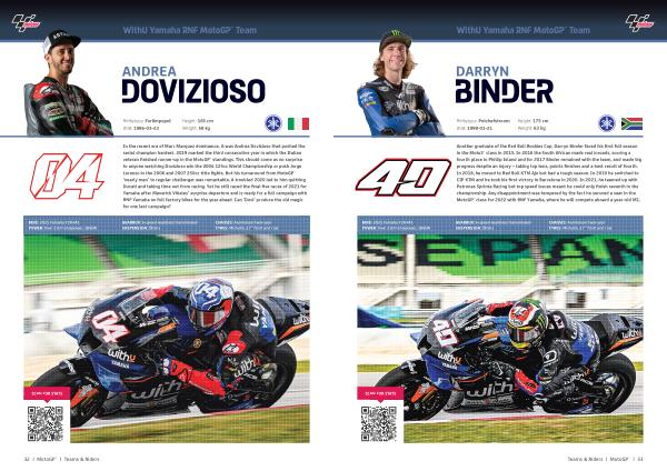 Another graduate of the Red Bull Rookies Cup , Darryn Binder faced his first full season in the Moto3™ class in 2015 . In 2016 the South African made real inroads , scoring a fourth place in Phillip Island and for 2017 Binder remained with the team , and made big progress despite an injury – taking top tens , points finishes and a best result of fourth . In 2018 , he moved to Red Bull KTM Ajo but had a tough season . In 2019 he switched to CIP KTM and he took his first victory in Barcelona in 2020 . In 2021 , he teamed up with Petronas Sprinta Racing but top speed issues meant he could only finish seventh in the championship . Any disappointment was tempered by the fact he secured a seat in the MotoGP™ class for 2022 with RNF Yamaha , where he will compete aboard a year-old M1 .