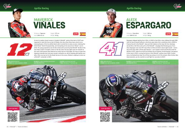 Espargaro skipped quickly from 125cc in 2005 to the 250cc class midway through 2006 until he found himself without a ride three years later . But a substitute ride in 2009 for Pramac Ducati in the MotoGP™ class put this Catalan on the map . His four showings earned him a full-time call up for a full MotoGP™ campaign the following year . From there Espargaro won two CRT class titles in 2012 and 2013 . He brought Suzuki – returning to the class after a three-year absence – up to speed in 2015 and did the same for Aprilia in 2017 , when he scored two brilliant top six finishes . He led Aprilia ’ s resurgence in the class in 2021 , scoring the factory ’ s first MotoGP™ podium since 2000 . Furthermore , he finished less than 10s off the race winner in 8 of 18 contests . After further bike improvements , can he now kick on and fight for race wins in 2022 ?