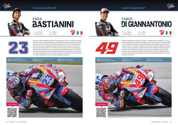 Fabio Di Giannantonio caused a stir in 2016 – his debut season in Grand prix – by outshining more fancied rookies Nicolo Bulega and Aron Canet across 18 races while riding for the Gresini Moto3™ squad . An expected championship challenge never quite materialised in 2017 or 2018 when riding for the same squad , although ‘ Diggia ’ showed his class by scoring two podiums in each of his two seasons riding for the Speed Up team in Moto2™ . He moved back to the Gresini Moto2 squad and a Kalex chassis for 2021 , but aside from a brilliant win at Jerez , he failed to fight at the front regularly . Still , he received a call up to Gresini ’ s satellite Ducati team for 2022 where he will contest the season aboard a GP21 .