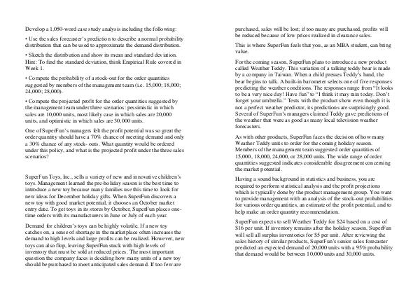 SuperFun expects to sell Weather Teddy for $ 24 based on a cost of $ 16 per unit. If inventory remains after the holiday season, SuperFun will sell all surplus inventories for $ 5 per unit. After reviewing the sales history of similar products, SuperFun’ s senior sales forecaster predicted an expected demand of 20,000 units with a 95 % probability that demand would be between 10,000 units and 30,000 units.