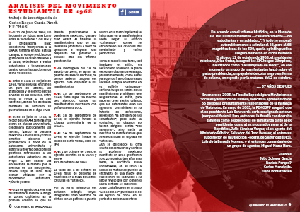 De acuerdo con el informe histórico, en la Plaza de las Tres Culturas murieron ―cabalísticamente― 68 estudiantes y un soldado…”. Y todo se empezó automáticamente a asimilar al 68, pero al 68 magnificado: al de los 500, que la opinión publica asegura murieron en dicha matanza