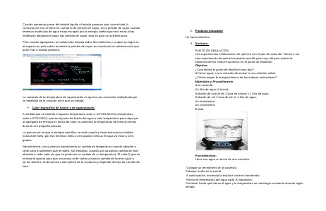 PUNTO DE EBULLICIÓN Los experimentos el laboratorio de química son el pan de cada día. Vamos a ver este experimento de química bastante sencillo pero muy útil para aclarar la influencia de los enlaces químicos en el punto de ebullición. Objetivo: ¿ Cual tendrá el punto de ebullición mas alto? Si hervir agua, o una solución de azúcar o una solución salina ¿ Cómo romper la energía térmica de los enlaces moleculares? Materiales y Procedimiento Una cacerola, Un litro de agua( 4 tazas); Solución de Azúcar de 1 taza de azúcar y 1 litro de agua. Solución de sal 1 taza de sal en 1 litro de agua, Un termómetro. Un cronómetro. Estufa.