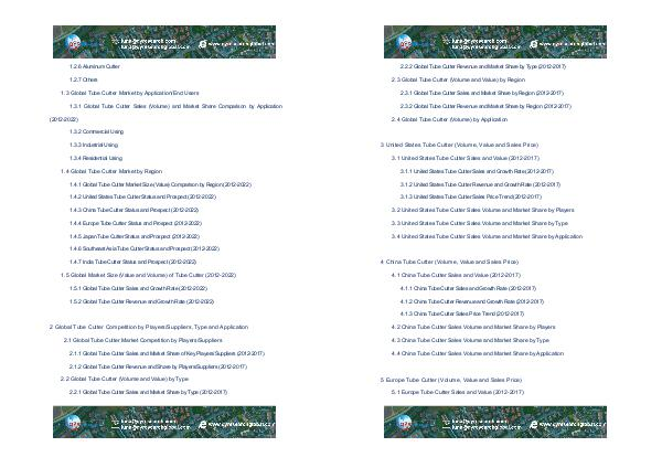 2.2.2 Global Tube Cutter Revenue and Market Share by Type (2012-2017) 2.3 Global Tube Cutter (Volume and Value) by Region 2.3.1 Global Tube Cutter Sales and Market Share by Region (2012-2017) 2.3.2 Global Tube Cutter Revenue and Market Share by Region (2012-2017) 2.4 Global Tube Cutter (Volume) by Application 3 United States Tube Cutter (Volume, Value and Sales Price) 3.1 United States Tube Cutter Sales and Value (2012-2017) 3.1.1 United States Tube Cutter Sales and Growth Rate (2012-2017) 3.1.2 United States Tube Cutter Revenue and Growth Rate (2012-2017) 3.1.3 United States Tube Cutter Sales Price Trend (2012-2017) 3.2 United States Tube Cutter Sales Volume and Market Share by Players 3.3 United States Tube Cutter Sales Volume and Market Share by Type 3.4 United States Tube Cutter Sales Volume and Market Share by Application 4 China Tube Cutter (Volume, Value and Sales Price) 4.1 China Tube Cutter Sales and Value (2012-2017) 4.1.1 China Tube Cutter Sales and Growth Rate (2012-2017) 4.1.2 China Tube Cutter Revenue and Growth Rate (2012-2017) 4.1.3 China Tube Cutter Sales Price Trend (2012-2017) 4.2 China Tube Cutter Sales Volume and Market Share by Players 4.3 China Tube Cutter Sales Volume and Market Share by Type 4.4 China Tube Cutter Sales Volume and Market Share by Application 5 Europe Tube Cutter (Volume, Value and Sales Price) 5.1 Europe Tube Cutter Sales and Value (2012-2017)
