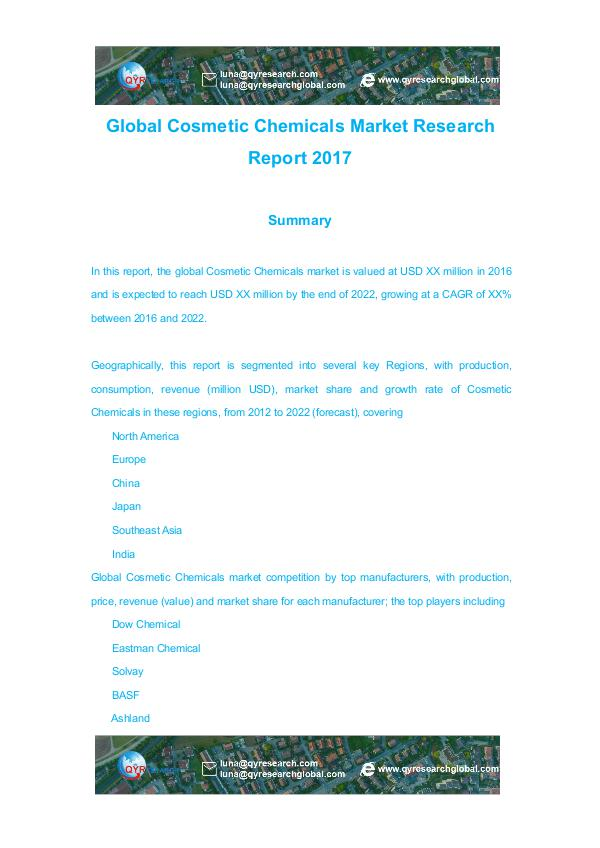 In this report, the global Cosmetic Chemicals market is valued at USD XX million in 2016