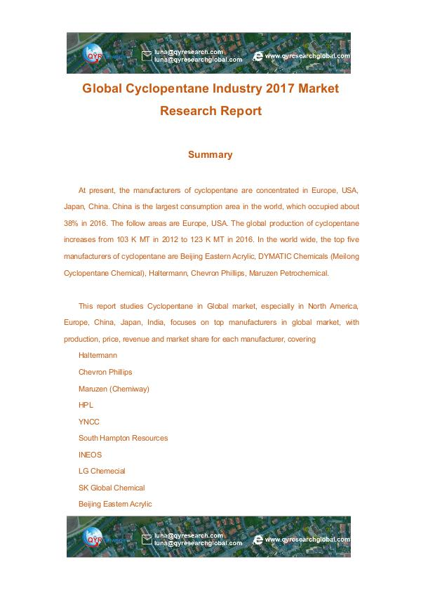 QYRESEARCH Global Cyclopentane Industry 2017 Market Research