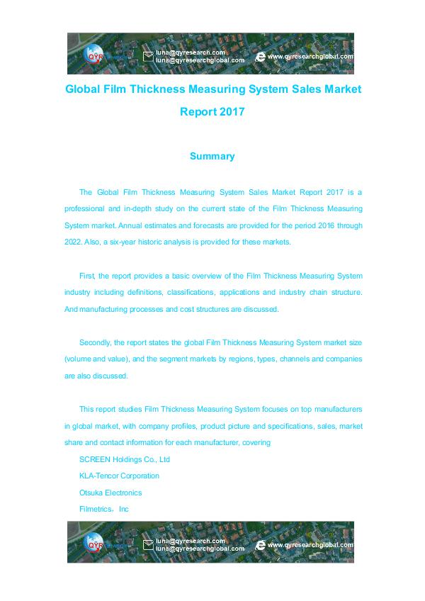 The Global Film Thickness Measuring System Sales Market Report 2017 is a
