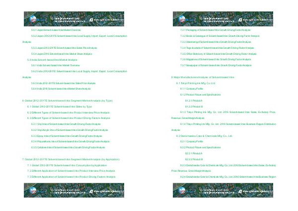 7 Global 2012-2017E Solvent-based Inks Segment Market Analysis( by Application) 7.1 Global 2012-2017E Solvent-based Inks Consumption by Application 7.2 Different Application of Solvent-based Inks Product Interview Price Analysis 7.3 Different Application of Solvent-based Inks Product Driving Factors Analysis