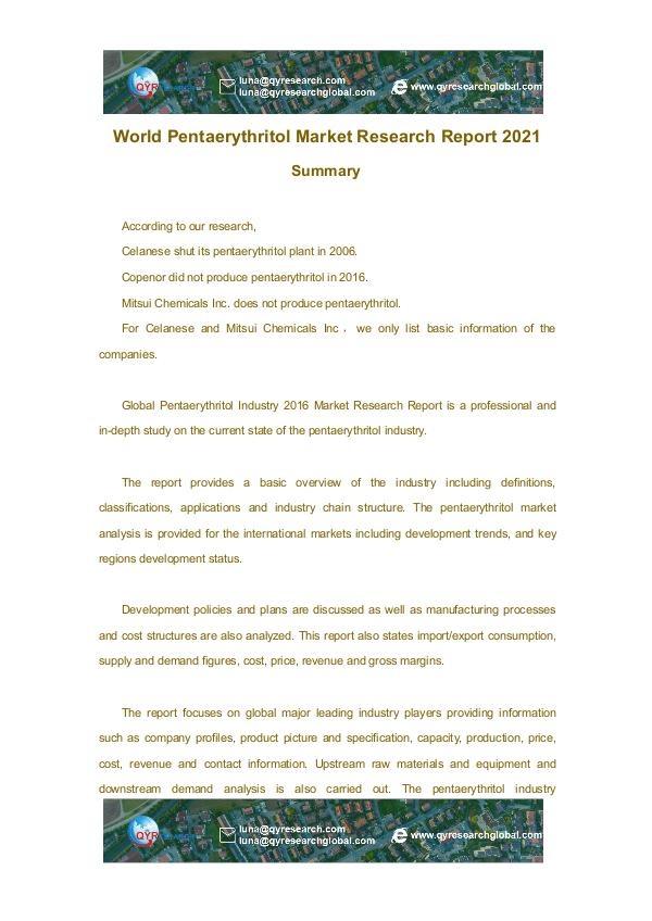 QYRESEARCH World Pentaerythritol Market Research Report 2021