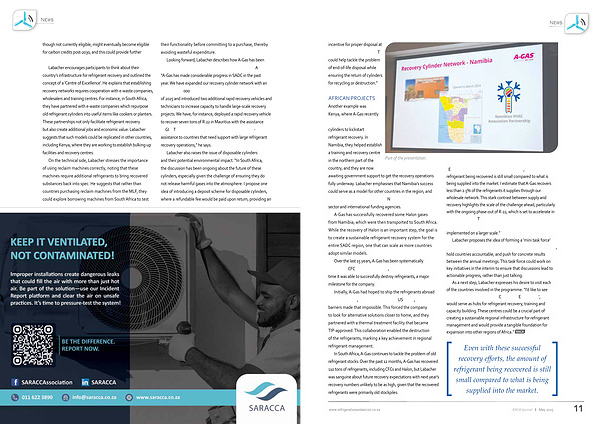AFRICAN PROJECTS Another example was Kenya, where A-Gas recently delivered a fleet of recovery cylinders to kickstart refrigerant recovery. In Namibia, they helped establish a training and recovery centre in the northern part of the