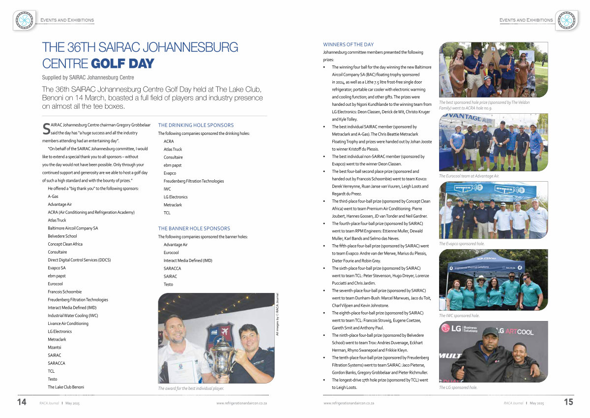 “ On behalf of the SAIRAC Johannesburg committee, I would like to extend a special thank you to all sponsors – without you the day would not have been possible. Only through your continued support and generosity are we able to host a golf day of such a high standard and with the bounty of prizes.” He offered a“ big thank you” to the following sponsors: A-Gas Advantage Air ACRA( Air Conditioning and Refrigeration Academy) Atlas Truck Baltimore Aircoil Company SA Belvedere School Concept Clean Africa Consultaire Direct Digital Control Services( DDCS) Evapco SA ebm papst Eurocool Francois Schoombie Freudenberg Filtration Technologies Interact Media Defined( IMD) Industrial Water Cooling( IWC) Livance Air Conditioning LG Electronics Metraclark Mzantsi SAIRAC SARACCA TCL Testo The Lake Club Benoni