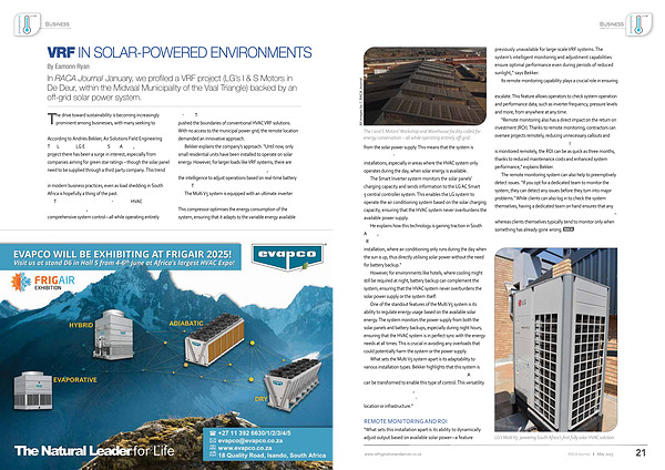 In RACA Journal January, we profiled a VRF project( LG’ s I & S Motors in De Deur, within the Midvaal Municipality of the Vaal Triangle) backed by an off-grid solar power system.
