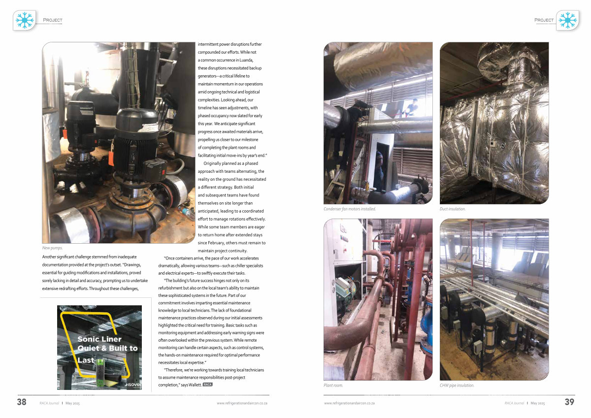 New pumps. Another significant challenge stemmed from inadequate documentation provided at the project ' s outset.“ Drawings, essential for guiding modifications and installations, proved sorely lacking in detail and accuracy, prompting us to undertake extensive redrafting efforts. Throughout these challenges, intermittent power disruptions further compounded our efforts. While not a common occurrence in Luanda, these disruptions necessitated backup generators— a critical lifeline to maintain momentum in our operations amid ongoing technical and logistical complexities. Looking ahead, our timeline has seen adjustments, with phased occupancy now slated for early this year. We anticipate significant progress once awaited materials arrive, propelling us closer to our milestone of completing the plant rooms and facilitating initial move-ins by year ' s end.”