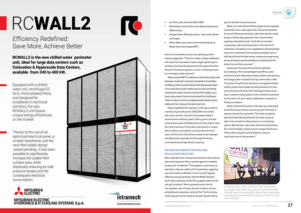 However, the discussion also touched on significant local challenges. Perrin acknowledged South Africa ' s water constraints, despite what he perceived as a better water planning and storage system compared to Europe, where water is often " let go down the grid " due to abundance. He suggested that the industry needs to look broader, borrowing solutions from other sectors like pharmaceuticals which utilise glycol-based, closedloop or waterless cooling systems in their critical and constrained environments. This cross-industry collaboration is essential for finding new solutions.