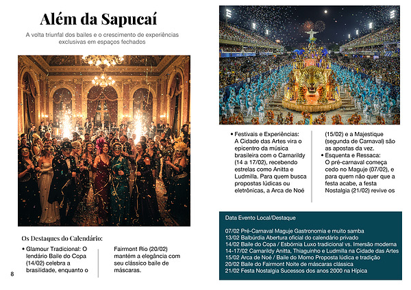 Glamour Tradicional: O lendário Baile do Copa (14/02) celebra a brasilidade, enquanto o Fairmont Rio (20/02) mantém a elegância com seu clássico baile de máscaras.