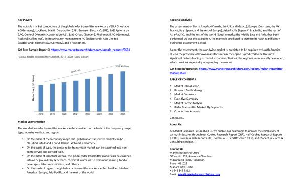 1 . Market Introduction 2 . Research Methodology 3 . Market Dynamics 4 . Executive Summary 5 . Market Factor Analysis 6 . Radar Transmitter Market , By Segments 7 . Competitive Analysis