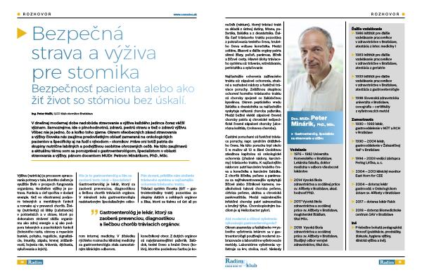 V dnešnej modernej dobe nadobúda stravovanie a výživa každého jedinca čoraz väčší význam . Samozrejme , ide o plnohodnotnú , zdravú , pestrú stravu a tiež o zdravú výživu . Vôbec nie je jedno , čo a koľko toho zjeme . Okrem všeobecných zásad stravovania a výživy človeka nás zaujíma predovšetkým oblasť zameraná na onkologických pacientov a špecificky aj na ľudí s vývodom – stomikov . Práve oni totiž patria do skupiny nutrične labilných a podvýživou osobitne ohrozených osôb . Na túto zaujímavú a aktuálnu tému som sa porozprával s gastroenterológom , špecialistom v oblasti stravovania a výživy , pánom docentom MUDr . Petrom Minárikom , PhD ., MSc .
