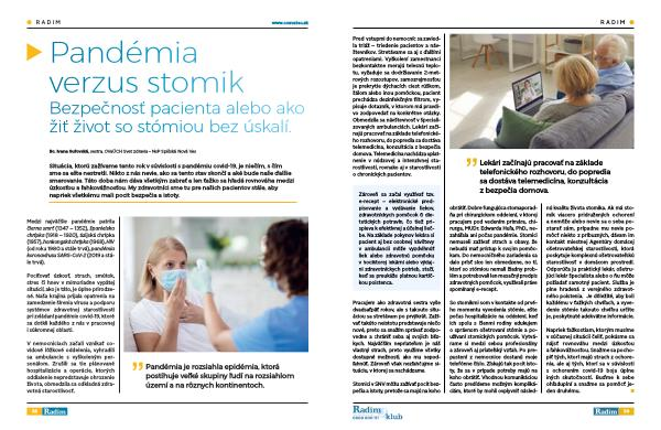 obrátiť . Dobre fungujúca stomaporadňa pri chirurgickom oddelení , v ktorej pracujem pod ve dením primára , chirurga , MUDr . Edwarda Hu ľa , PhD ., nezaháľala ani počas pan démie . Stomici nemuseli zažívať strach a obavy , že nebudú mať prístup k svojim pomôckam . Do nemocničného zariadenia sa dalo prísť síce len obmedzene , no tí , ktorí so stómiou nemali žiadny problém a potrebovali len mesačný predpis zdravotných pomôcok , využívali práve spomínaný e-recept .