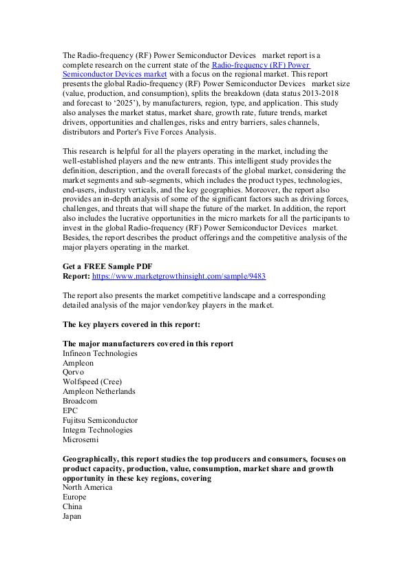 The Radio-frequency (RF) Power Semiconductor Devices market report is a