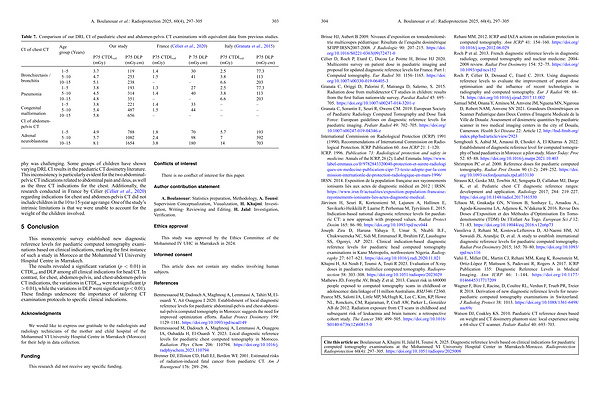 Benmessaoud M, Dadouch A, Maghnouj A, Lemmassi A, Tahiri M, Elouardi Y, Ait Ouaggou I 2020. Establishment of local diagnostic reference levels for paediatric abdominal-pelvis and chest-abdominal-pelvis computed tomography in Morocco: suggests the need for improved optimization efforts. Radiat Protect Dosimetry 199: 1129 – 1141. https:// doi. org / 10.1093 / rpd / ncad149