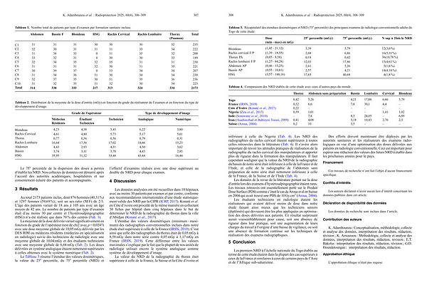 308 K. Adambounou et al.: Radioprotection 2025, 60( 4), 306 – 309 Tableau 3. Récapitulatif des étendues dosimétriques et NRD( 75 e percentile) des principaux examens de radiologie conventionnelle adulte du Togo de cette étude.
