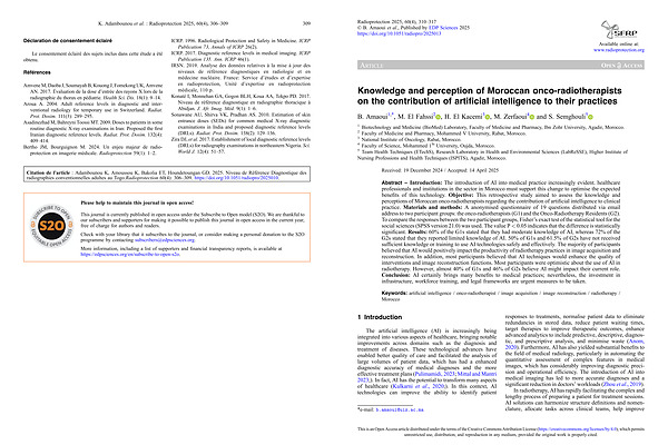 Abstract – Introduction: The introduction of AI into medical practice increasingly evident. healthcare professionals and institutions in the sector in Morocco must support this change to optimise the expected benefits of this technology. Objective: This retrospective study aimed to assess the knowledge and perceptions of Moroccan onco-radiotherapists regarding the contribution of artificial intelligence to clinical practice. Materials and methods: A anonymised questionnaire of 19 questions distributed via email address to two participant groups: the onco-radiotherapists( G1) and the Onco-Radiotherapy Residents( G2). To compare the responses between the two participant groups, Fisher’ s exact test of the statistical tool for the social sciences( SPSS version 21.0) was used. The value P < 0.05 indicates that the difference is statistically significant. Results: 60 % of the G1s stated that they had moderate knowledge of AI, whereas 72 % of the G2s stated that they reported limited knowledge of AI. 50 % of G1s and 61.5 % of G2s have not received sufficient knowledge or training to use AI technologies safely and effectively. The majority of participants believed that AI would positively impact the productivity of radiotherapy practices in image acquisition and reconstruction. In addition, most participants believed that AI techniques would enhance the quality of interventions and image reconstruction functions. Most participants were optimistic about the use of AI in radiotherapy. However, almost 40 % of G1s and 46 % of G2s believe AI might impact their current role. Conclusion: AI certainly brings many benefits to medical practices; nevertheless, the investment in infrastructure, workforce training, and legal frameworks are urgent measures to be taken.