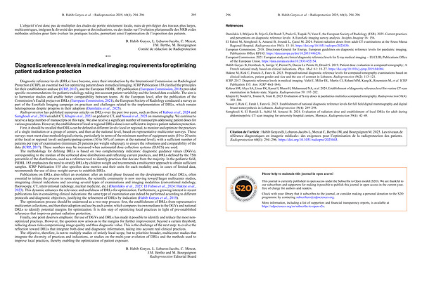 Diagnostic reference levels( DRLs) have become, since their introduction by the International Commission on Radiological Protection( ICRP), an essential tool for optimizing patient doses in medical imaging. ICRP Publication 135 clarified the principles for their establishment and use( ICRP, 2017), and the European PIDRL 185 publication( European Commission, 2018) provided specific recommendations for pediatric radiology, taking into account patient variability and the limited data available. The aim is to harmonize studies and enable better comparability between teams. At the European level, after the publication of the Commission’ s Euclid project on DRLs( European Commission, 2021), the European Society of Radiology conducted a survey as part of the EuroSafe Imaging campaign on practices and challenges related to the implementation of DRLs, which remain heterogeneous despite progress in their adoption( Damilakis et al., 2025).