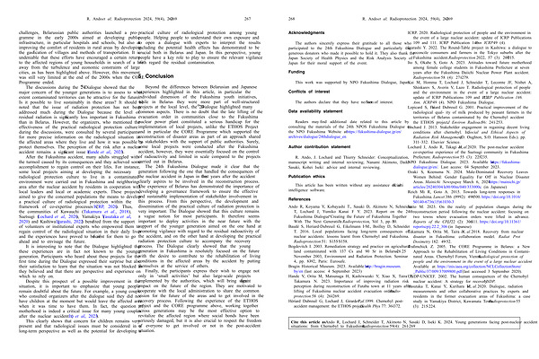 Ando R , Koyama Y , Kobayashi T ., Sasaki D , Akimoto N , Schneider T , Lochard J , Yumiko Kanai F Y . 2023 . Report on the 24th Fukushima Dialogue “ Creating the Future of Fukushima Together With The Next Generation ”. Radioprotection , Vol 3 , pp 5 – 10 . Baudé S , Heriard-Dubreuil G , Eikelmann I-M ., Boilley D , Schneider T . 2016 . Local populations facing long-term consequences of nuclear accidents : lessons learnt from Chernobyl and Fukushima . Radioprotection 51 : S155 – S158 .