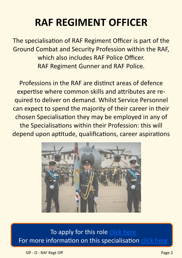 The specialisation of RAF Regiment Officer is part of the Ground Combat and Security Profession within the RAF, which also includes RAF Police Officer. RAF Regiment Gunner and RAF Police.