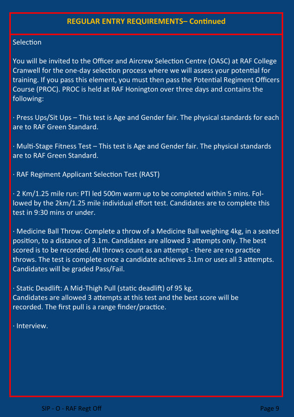 You will be invited to the Officer and Aircrew Selection Centre( OASC) at RAF College Cranwell for the one-day selection process where we will assess your potential for training. If you pass this element, you must then pass the Potential Regiment Officers Course( PROC). PROC is held at RAF Honington over three days and contains the following: