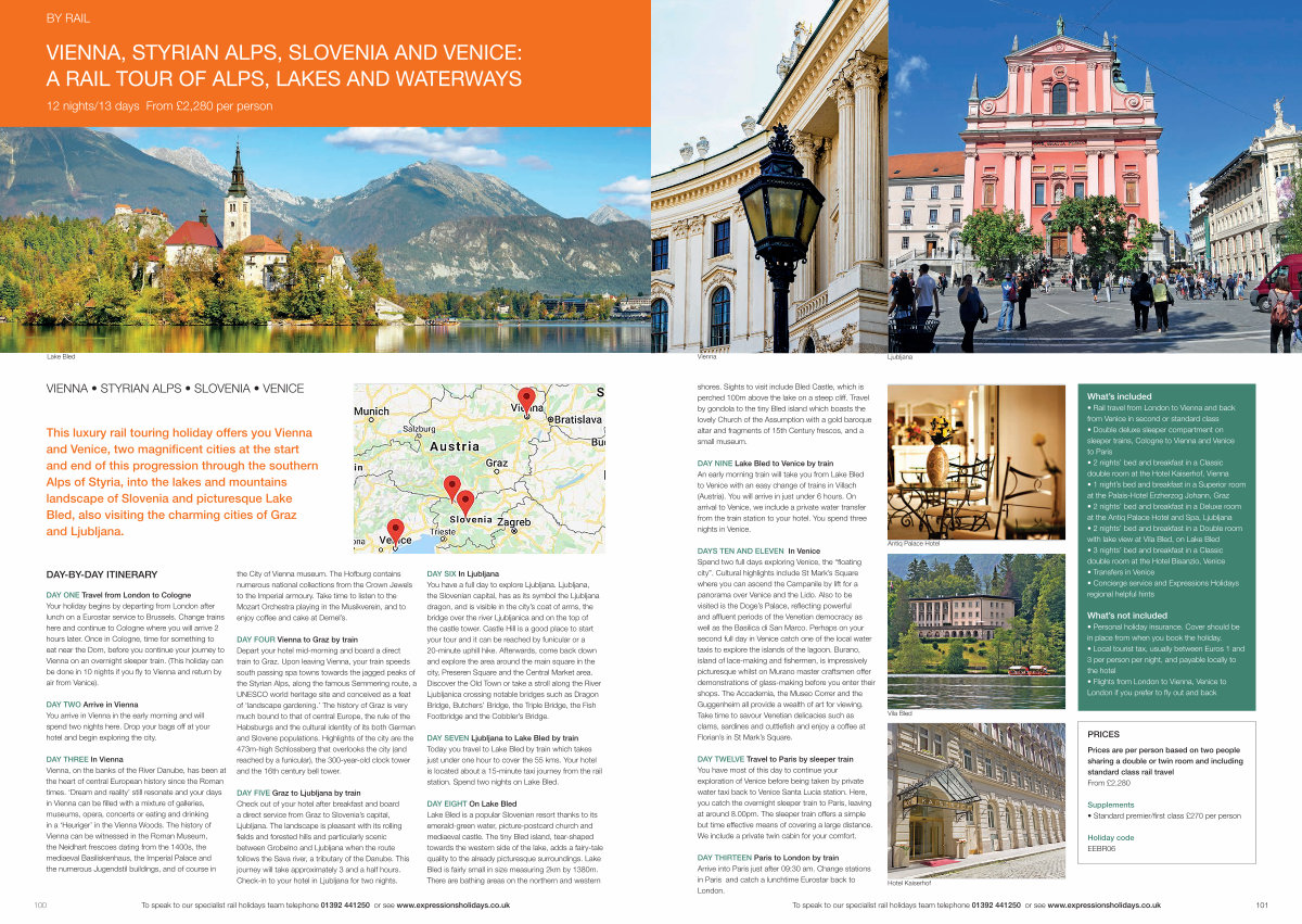 • Rail travel from London to Vienna and back from Venice in second or standard class