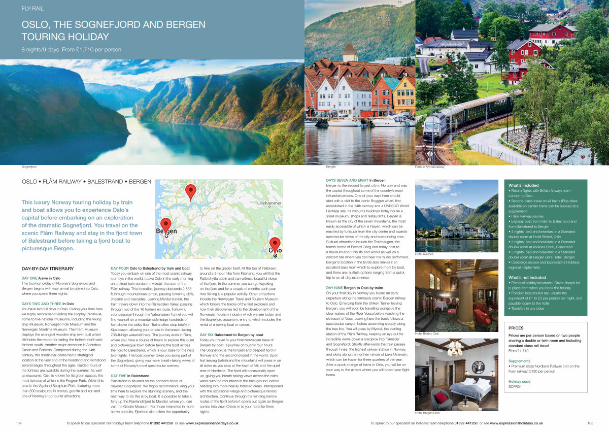 To speak to our specialist rail holidays team telephone 01392 441250 or see www. expressionsholidays. co. uk 105