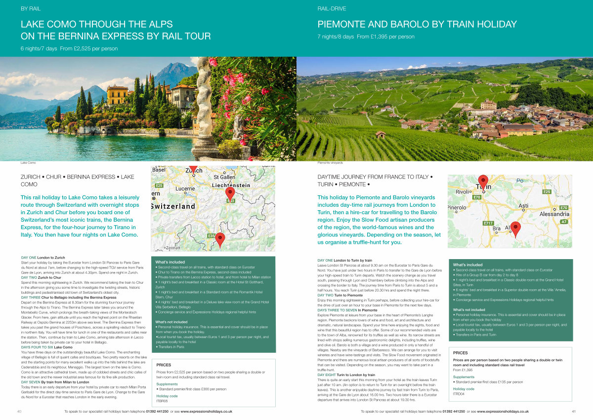 To speak to our specialist rail holidays team telephone 01392 441250 or see www. expressionsholidays. co. uk 41
