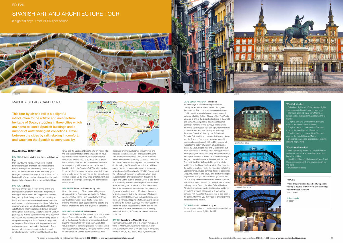 DAY ONE Arrive in Madrid and travel to Bilbao by train Start your touring holiday by flying into Madrid before catching an afternoon train northwards to Bilbao, arriving in the late evening. Travel to your hotel, the five-star Hotel Carlton, which enjoys a privileged position a few steps from the Plaza de Don Federico Moyúa and a short distance from the iconic Guggenheim Museum. Spend two nights in Bilbao.