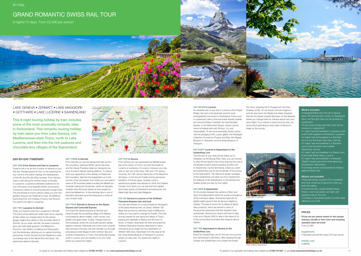 This 9-night touring holiday by train includes some of the most scenically romantic sites in Switzerland. This romantic touring holiday by train takes you from Lake Geneva, into Mediterranean-style Ticino, north to Lake Lucerne, and then into the rich pastures and chocolate-box villages of the Saanenland.