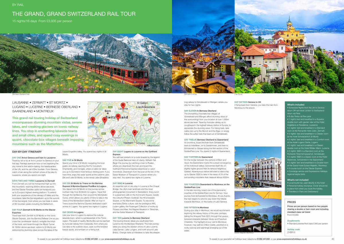 DAY FOURTEEN Saanenland to Montreux on the GoldenPass Line In the late morning, board one of the panoramic coaches of the GoldenPass Line for the two- hour journey from Schoenried to Montreux. At Les Avants, the train begins to wind its way down the hillside towards Montreux, on the banks of Lake Geneva.