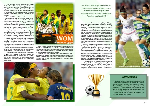 Eleita seis vezes a melhor jogadora do mundo, Marta é também a maior artilheira da história da Copa do Mundo de futebol feminino. Com os gols na Copa do Mundo de 2019, Marta ampliou a vantagem sobre alemã Birgit Prinz e a norte-americana Abby Wambach, que vêm na sequência como as maiores artilheiras dos mundias femininos e já se aposentaram.