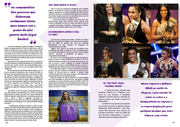 Não é a toa que a jogadora é conhecida como “Rainha Marta” e “A melhor do mundo”. Ao longo de sua carreira, a alagoana fez história no futebol mundial. Em 2006 encheu o país de orgulho ao ser eleita a melhor jogadora de futebol do mundo, orgulho esse que se espalhou pelos anos de 2007, 2008, 2009, 2010 e por último 2018.