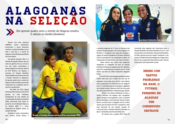 Mesmo com uma cobertura midiática quase inexistente, preconceito e apoio financeiro medíocre, o futebol feminino cresce mais a cada dia, e o estado de Alagoas é conhecido pela qualidade das suas atletas.